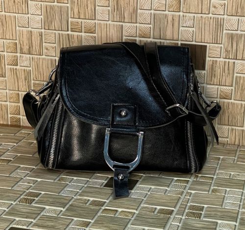 Женская сумка из экокожи.Сумка закрывается на клапан с кнопкой и на молнию. Внутри отделение, разделенное карманом на молнии по середине, боковые кармашки, один на молнии и два открытых. Снаружи, на задней стенке есть карман на молнии. На дне сумки металлические ножки. Регулируемый по длине наплечный ремень.